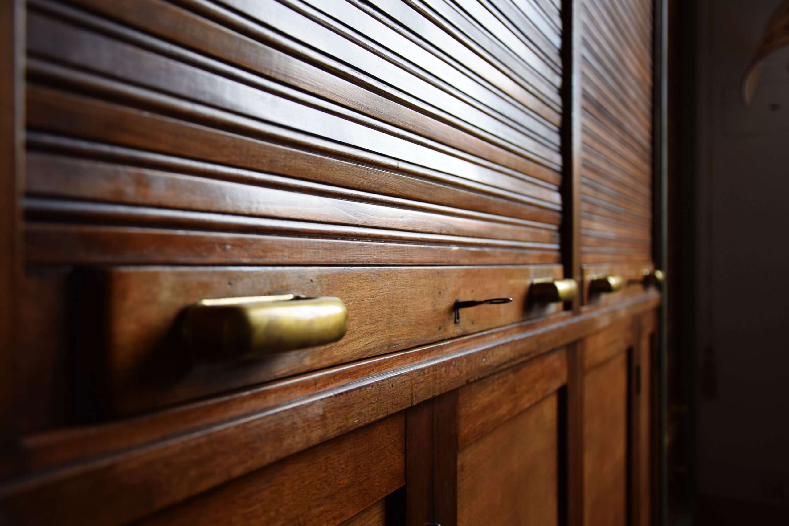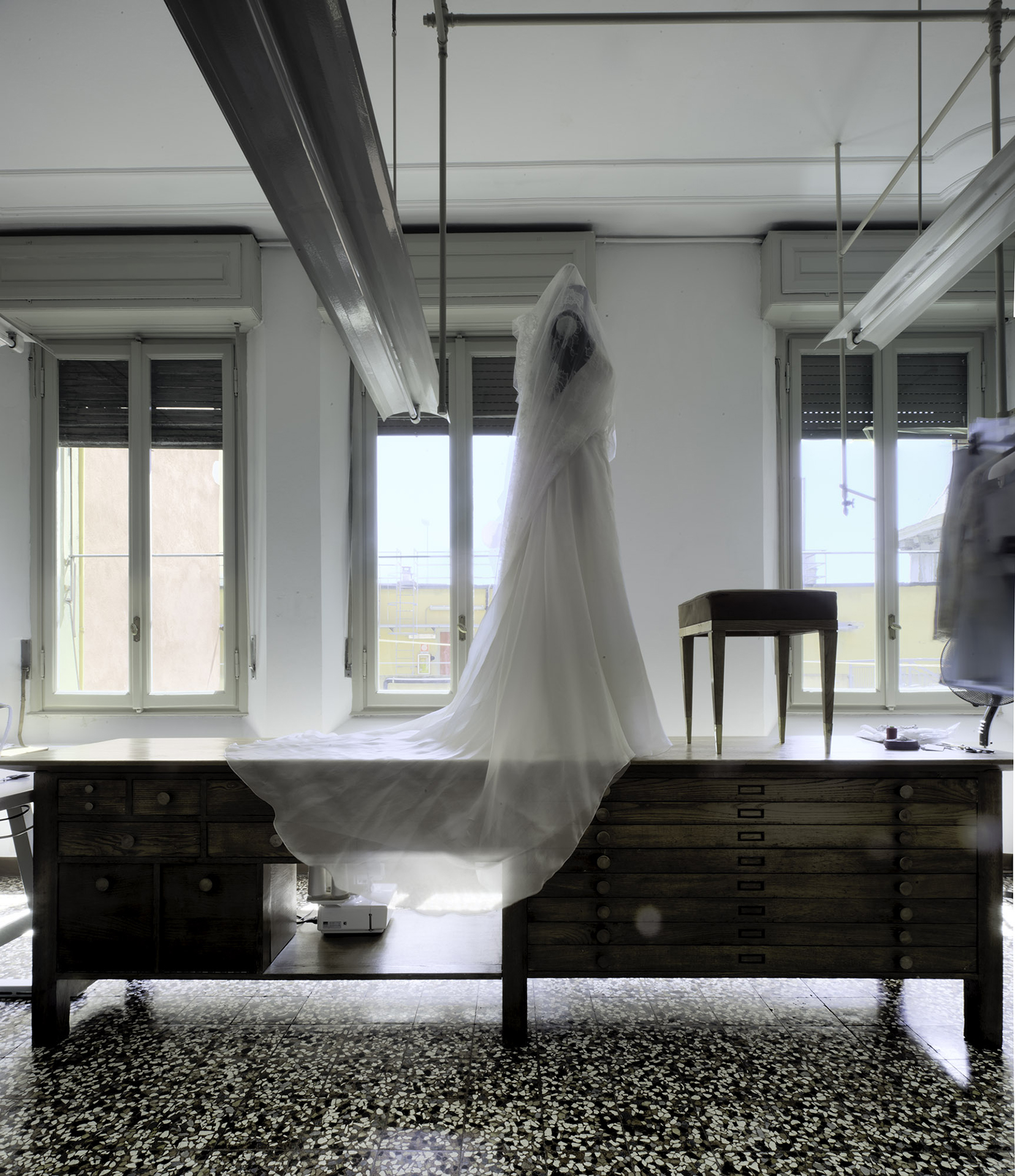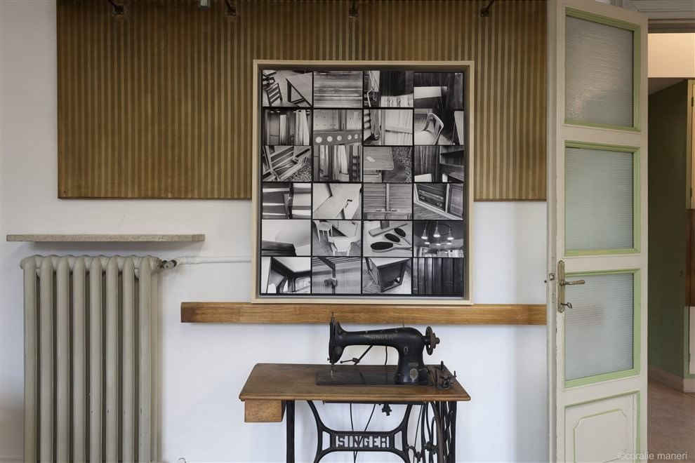 Il laboratorio vero e proprio, l’ambiente più ampio, accoglie ancora il grande tavolo da taglio con cassettiera e vari sistemi di aggancio e ricovero dei tessuti e dei lavorati, disegnati appositamente.