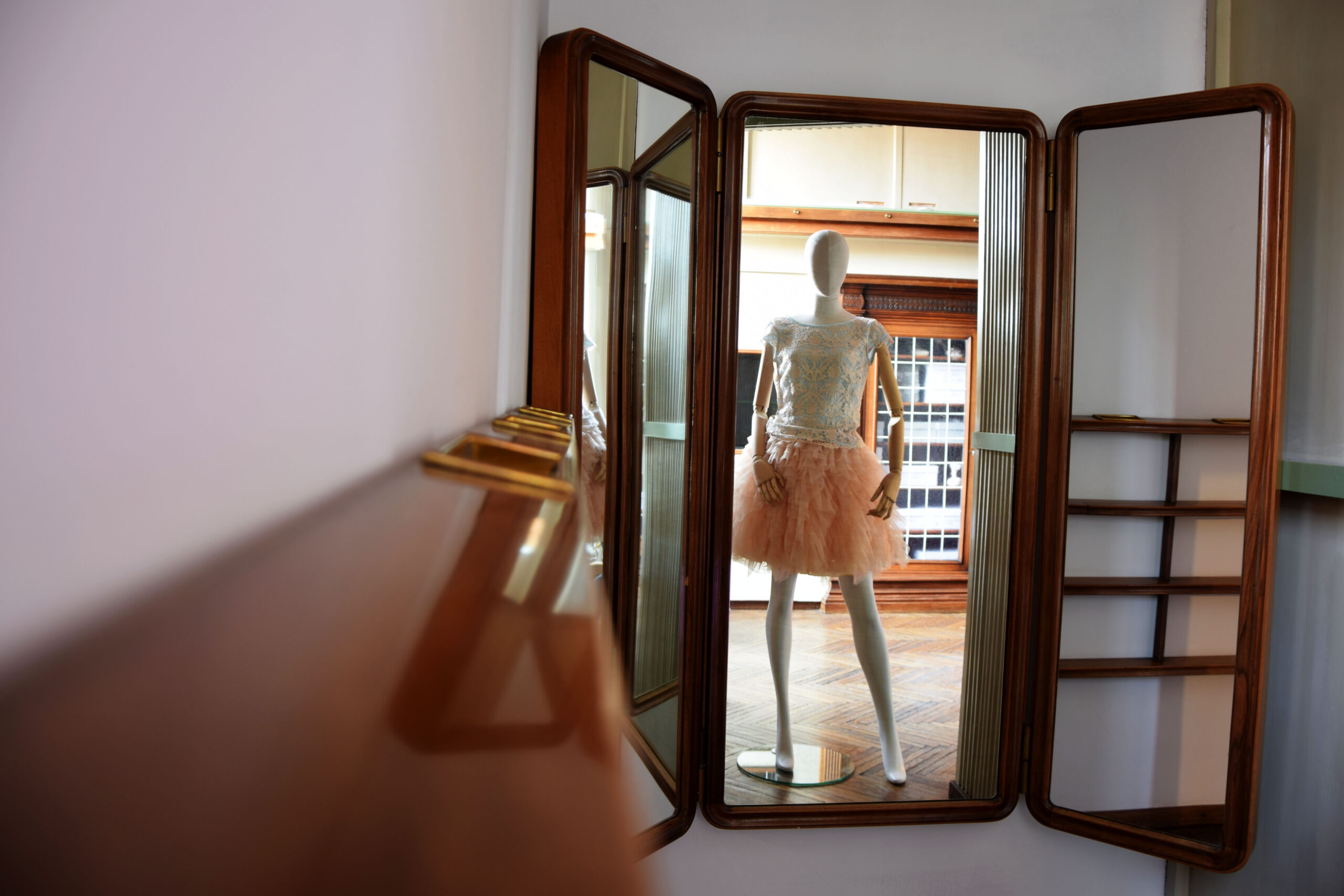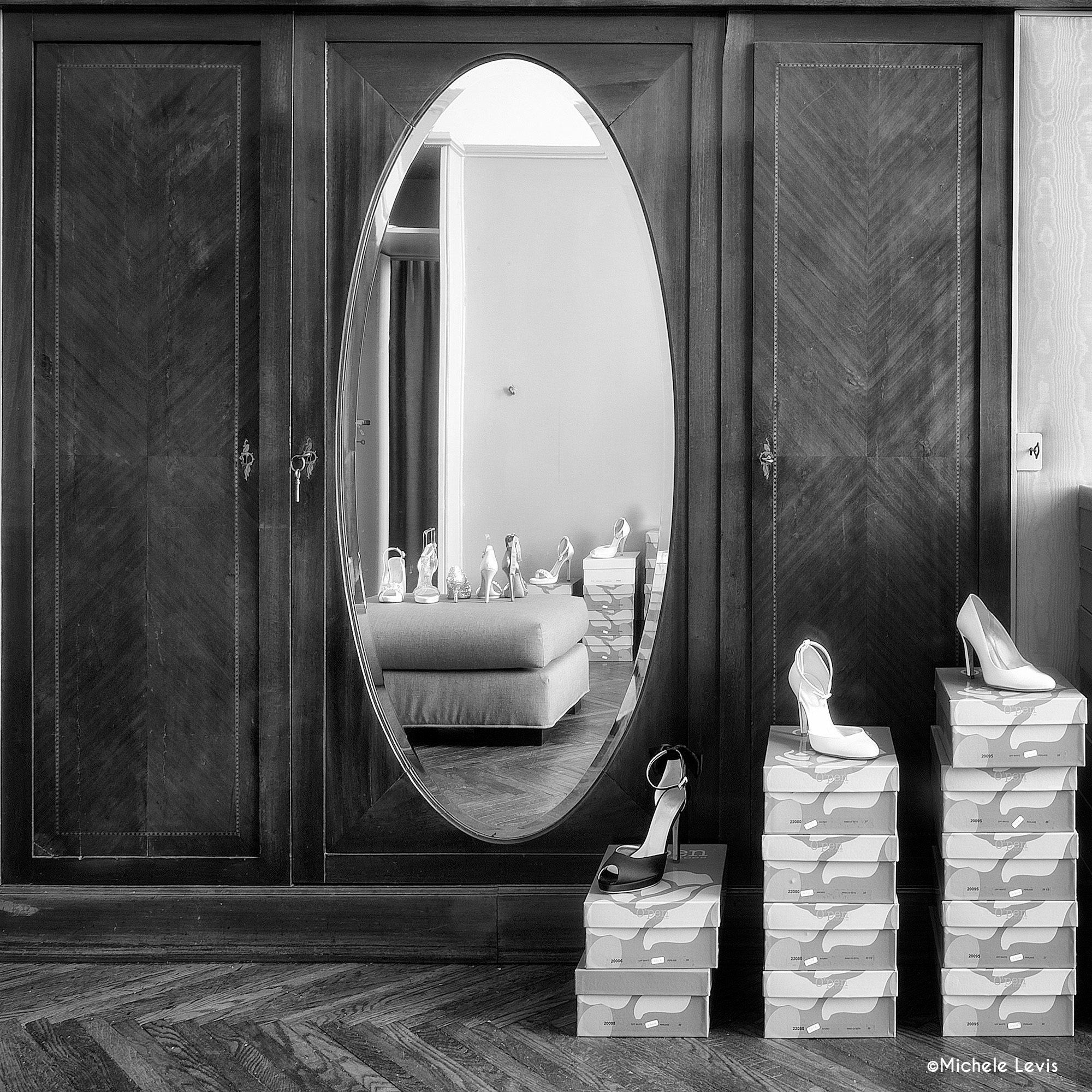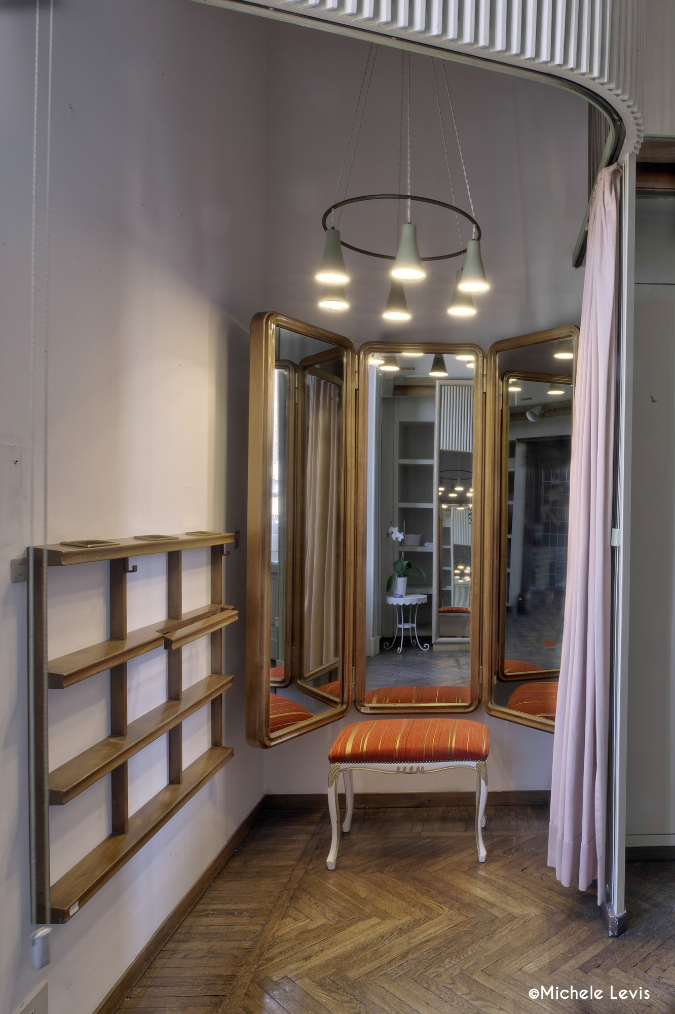 Il settore destinato alla clientela comprende due ampie sale mostra, gemelle, dotate ciascuna di una cabina di prova e di un sistema di contenitori variamente assortiti. Si nota tra l’altro l’inserimento di più antichi armadi provenienti dal precedente laboratorio del sarto, in tipico stile bolognese dei primi decenni del ‘900, collocati all’interno di un apparato realizzato su misura, che comprende vani chiusi e un coronamento attrezzato che supporta faretti spostabili e orientabili a piacere.