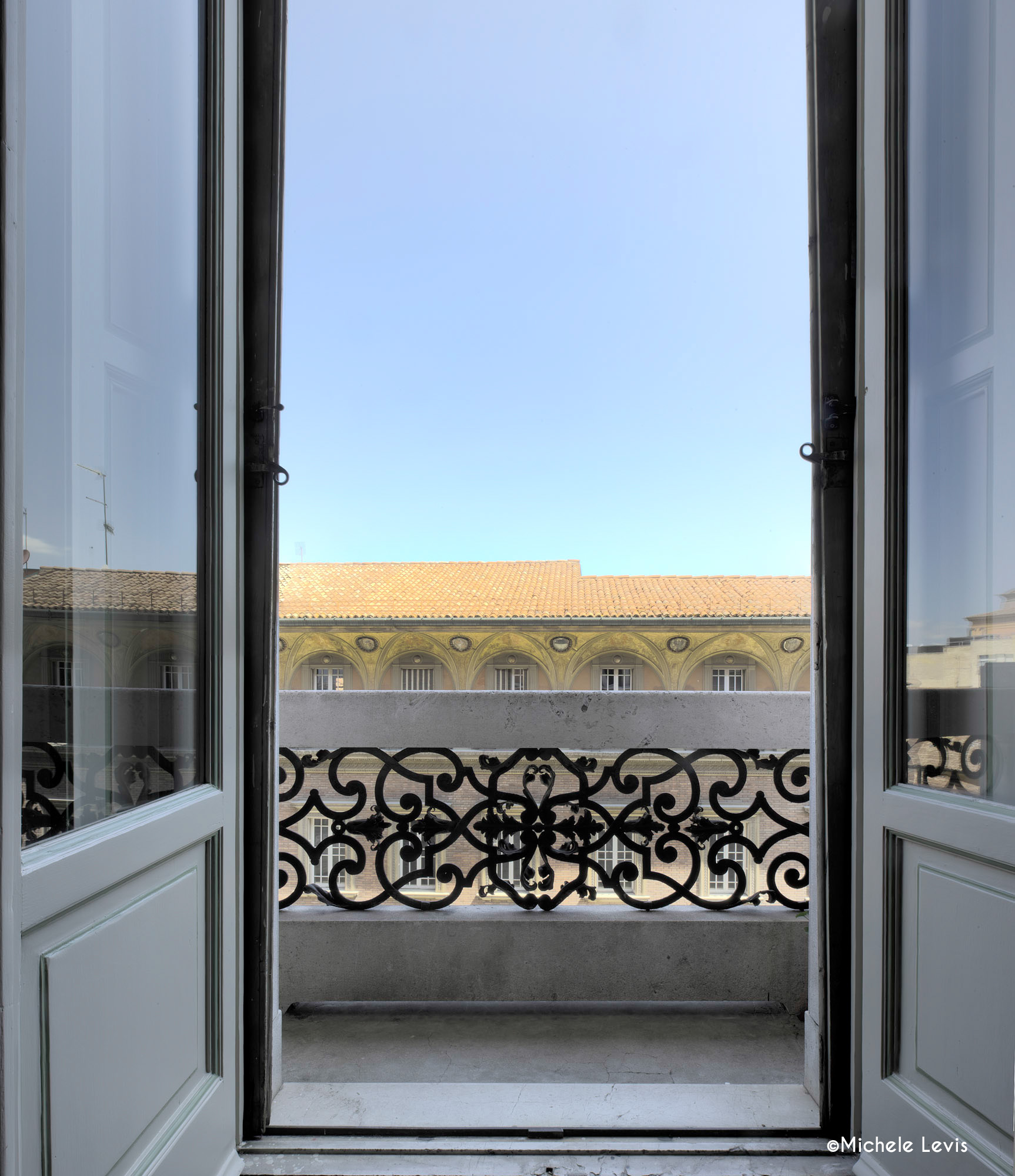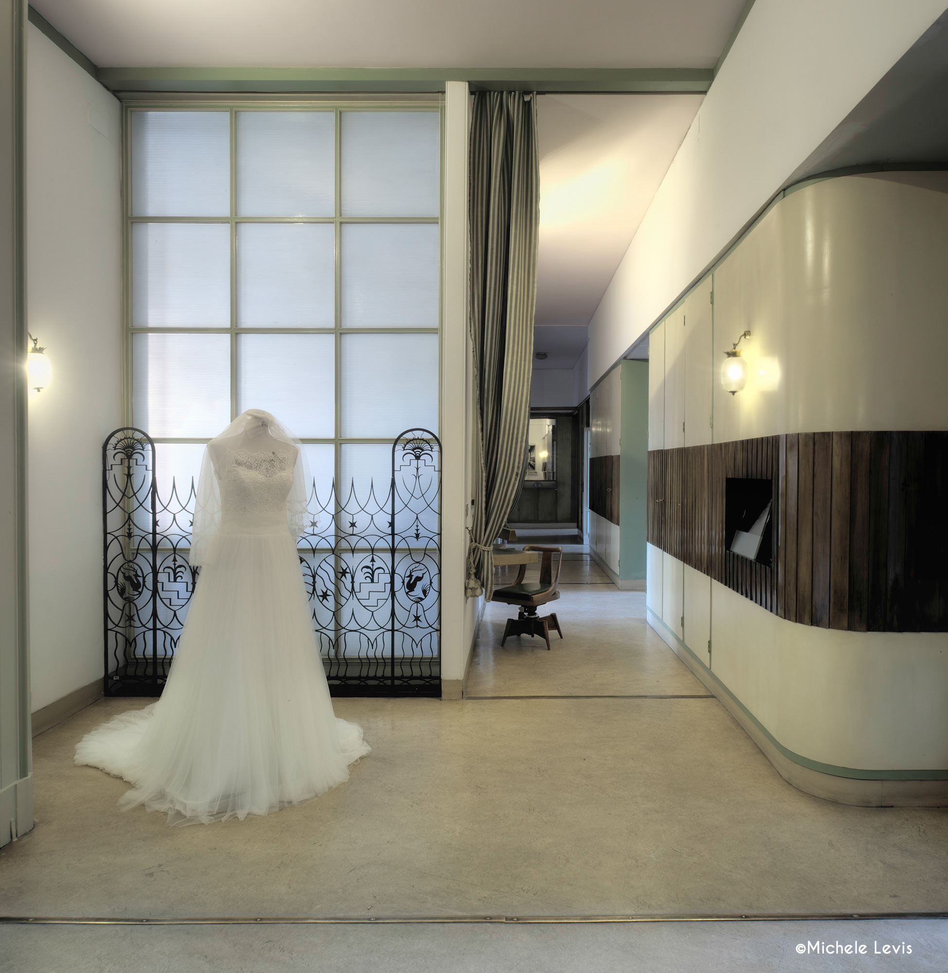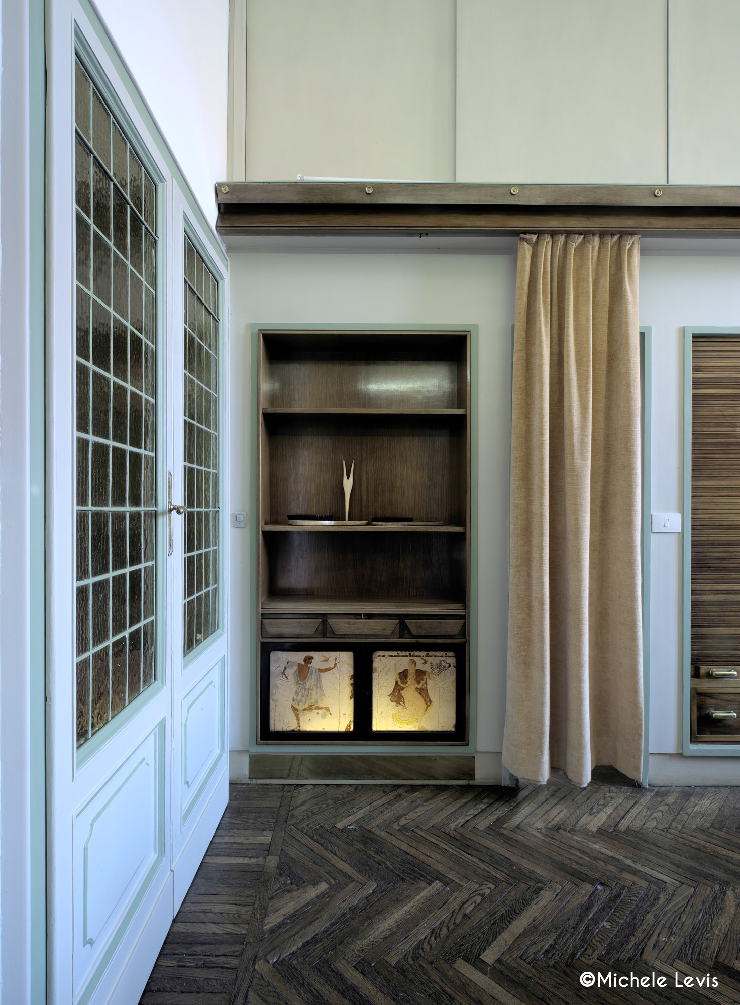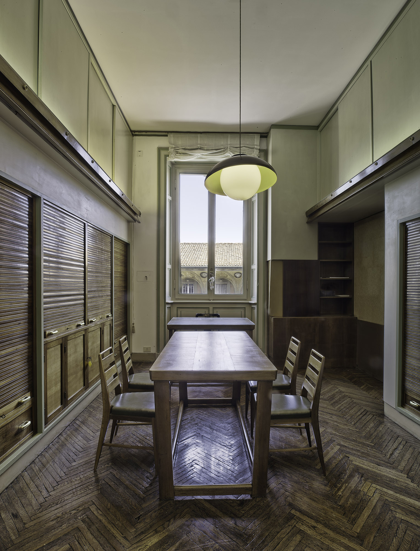 L’attiguo corridoio distributivo è anch’esso dotato di pannelli, armadiature e nicchie finalizzate all’attività di lavoro e di esposizione, che di fatto inglobano completamente le parti murarie esistenti, con un effetto prospettico particolarmente scenografico.