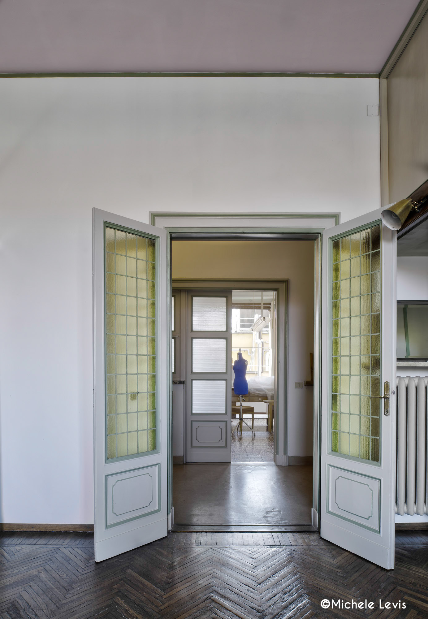La piccola ma attrezzatissima cucina, dove l’architetto adopera un gran numero di accorgimenti all’insegna di un affascinante razionalismo, fronteggia la sala da pranzo – ufficio, a sua volta concepita per soddisfare in modo confortevole le mutevoli esigenze della giornata del sarto, altalenante tra la sfera lavorativa e quella privata. La parte terminale dell’unità ospita la lavanderia, il bagno e la camera da letto, che costituiscono la parte più strettamente dedicata alla vita privata della famiglia. Una serie di porte passanti collega le stanze in sequenza, svincolandole dal corridoio, e permettendo una circolazione interna più riservata.